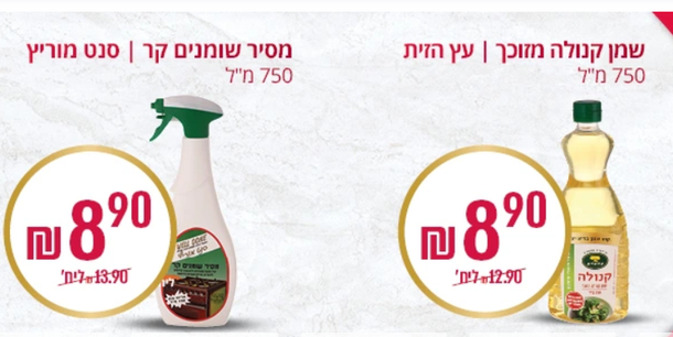 Например, каноловое масло, рис басмати или чистящее средство для плиты сейчас по цене 8.90 шек., 2 замороженные пиццы - 30 шек. и т.д.